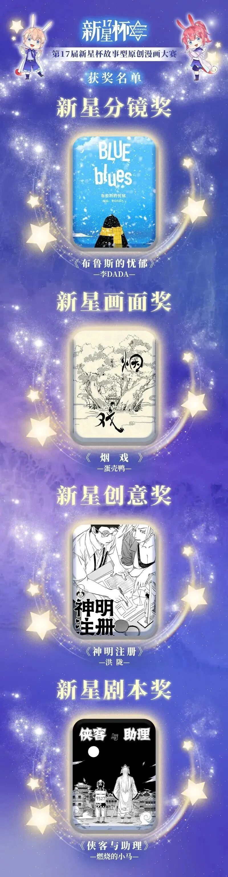 中国新星杯故事型原创漫画大赛由翻翻动漫联合集英社在2007年发起举办,面向全球华语作者,大赛以其特有的专业性与海外发展机会闻名。今年是新星杯成功举办的第17个年头,17年来,新星杯培育了近百名新人漫画家,其中有十余位作者成功登陆了海外市场。
