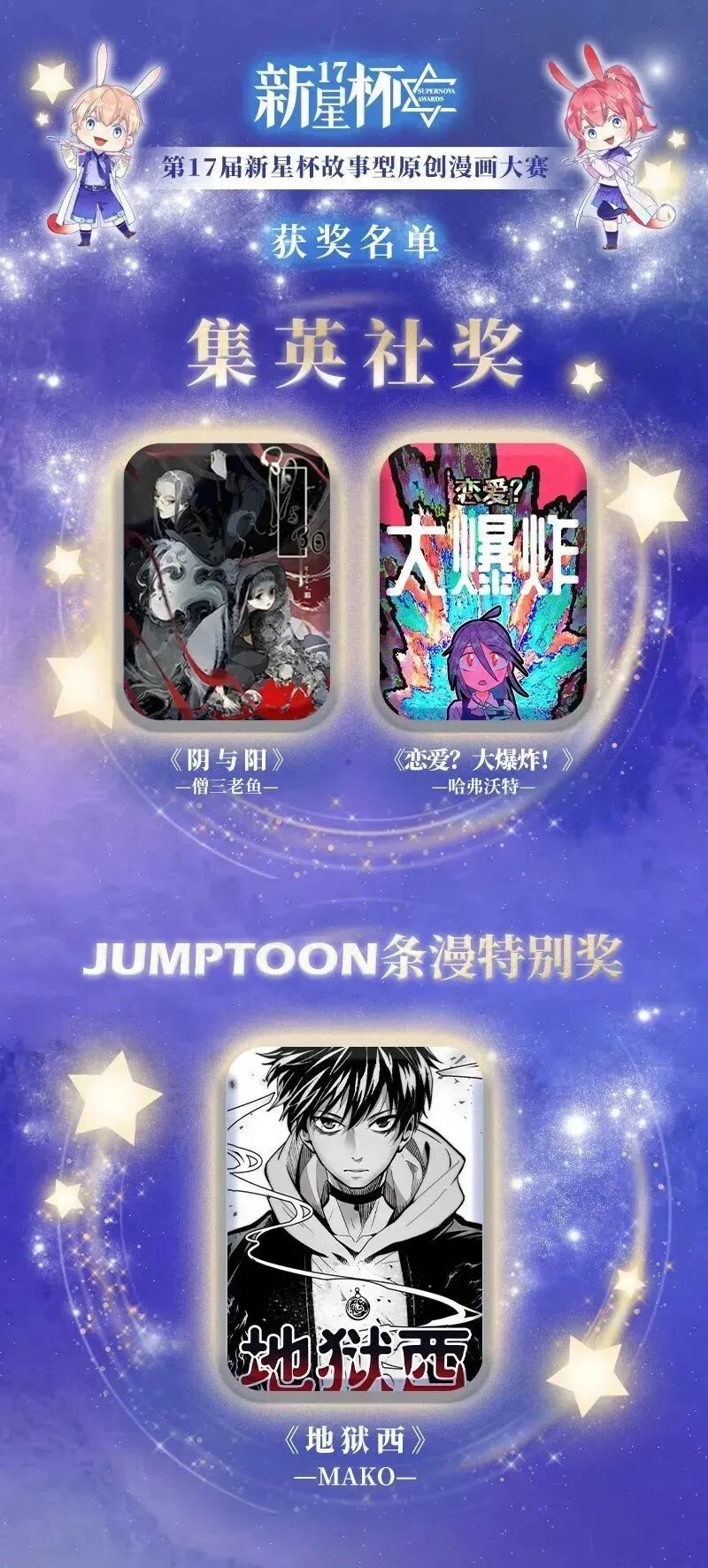 僧三老鱼与哈弗沃特两位作者还获得了全球最大漫画出版机构之一的集英社评选出的“集英社奖”。此外还有Mako的《地狱西》获得了今年首次设立的JUMPTOON条漫特别奖。
