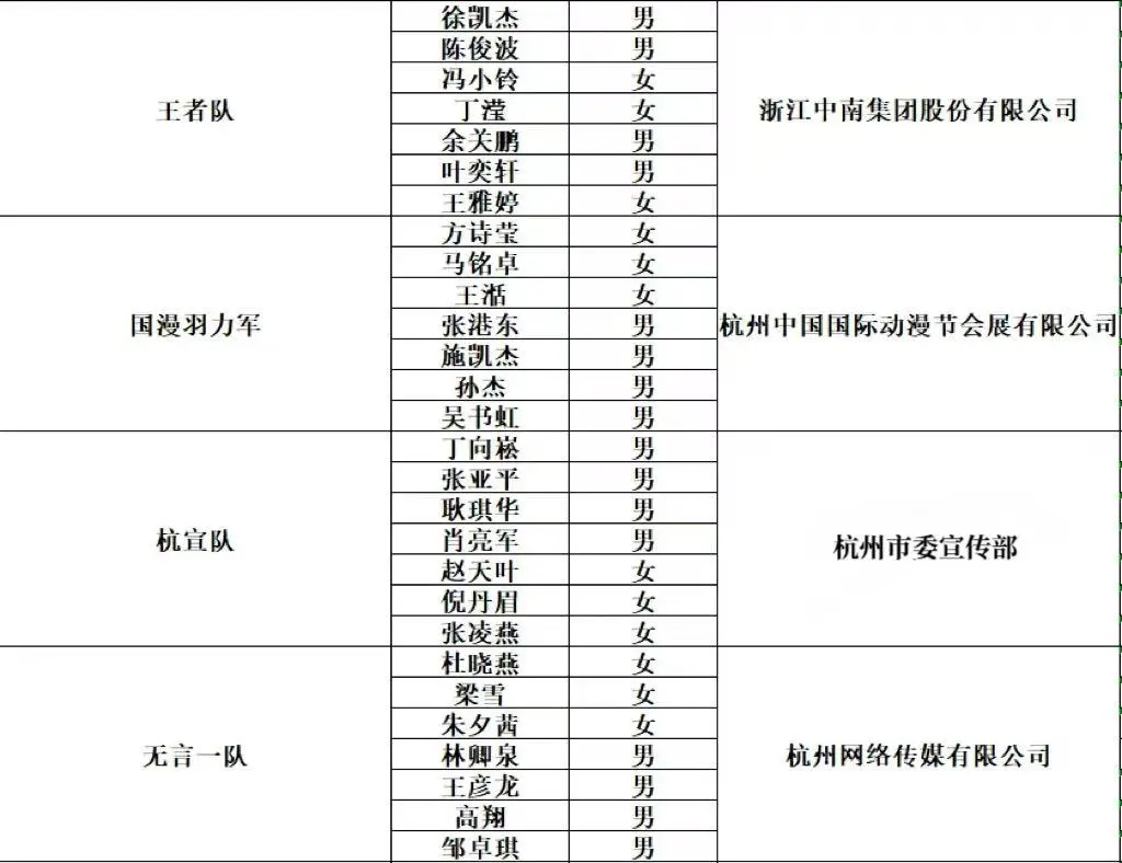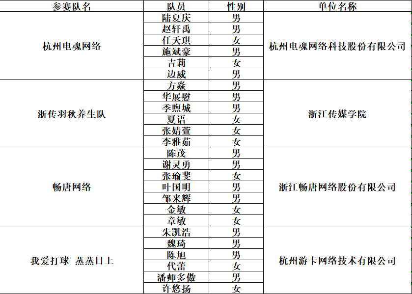 “电魂杯”2025年杭州市动漫游戏协会羽毛球友谊赛于2025年12月1日开始公开招募,截至12月12日共有10支队伍报名,现将参赛人员名单公示如下: