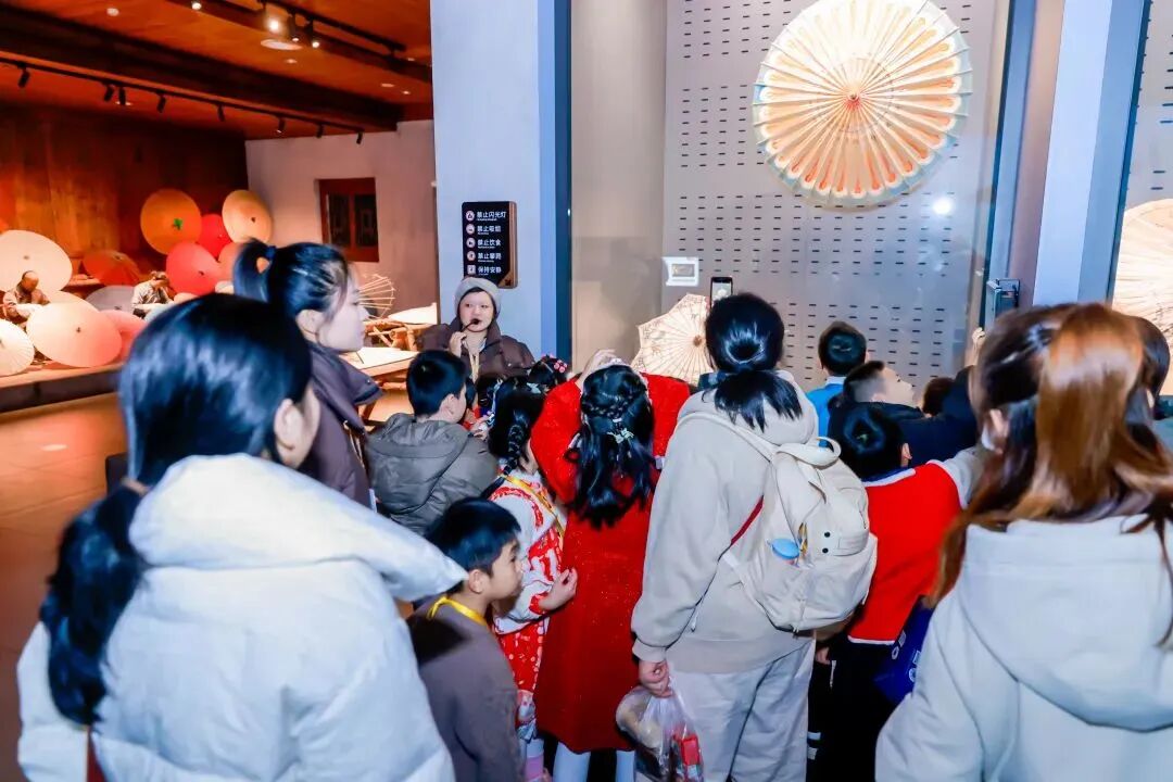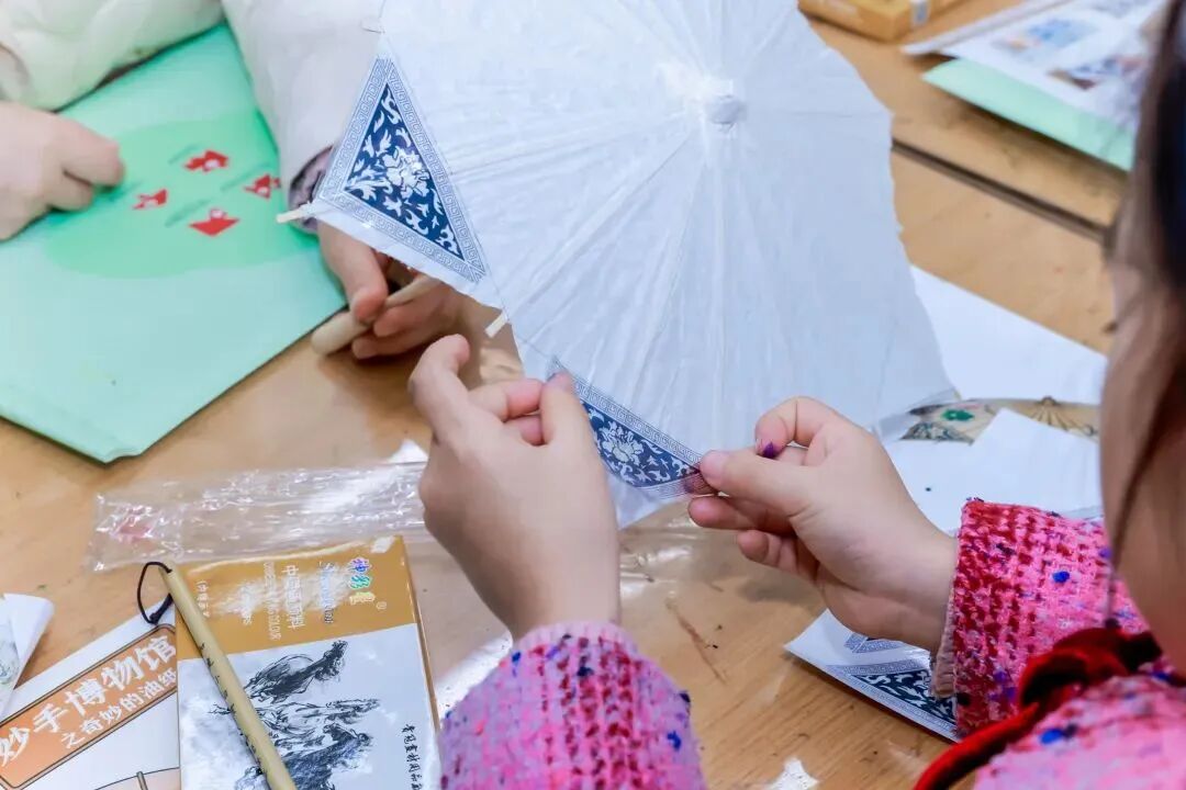 结合启动仪式,杭州工艺美术博物馆的老师带领小朋友参观了中国伞博物馆,学习了中国伞文化、西湖绸伞、油纸伞等相关知识,更是亲手制作了一把中国伞博物馆的镇馆之宝“八角伞”。